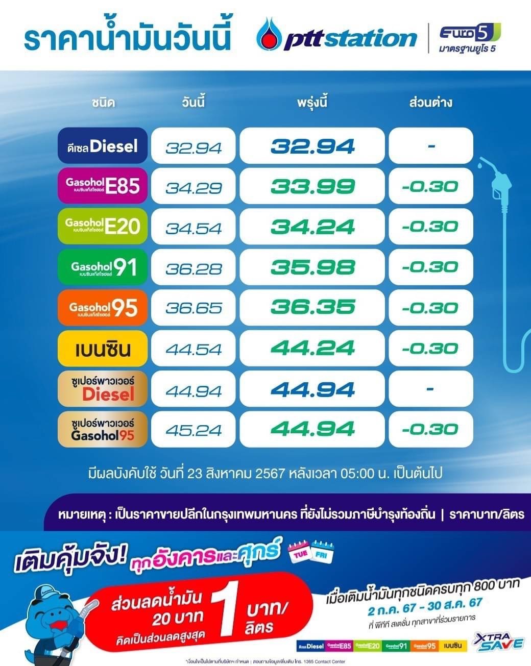 ปั๊มน้ำมันปรับราคากลุ่มเบนซินและแก๊สโซฮอล์ ลดลง 30 สต. ดีเซลคงเดิม มีผลตี 5 พรุ่งนี้ (23 ส.ค. 2567)
